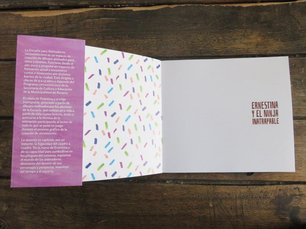 El relato de Ernestina y el ninja inatrapable fue creado a partir de dibujos de los chicos que participaron en la Escuela para Animadores ceroveinticinco desde 2007 a 2016, e invita a acercarse a la técnica de la animación participando al lector de todo lo que se pone en juego durante el proceso gráfico de la creación de movimiento. La publicación es una coproducción del Programa ceroveinticinco y la Editorial Municipal de Rosario, con textos de José Sainz y Francisco Sanguineti.