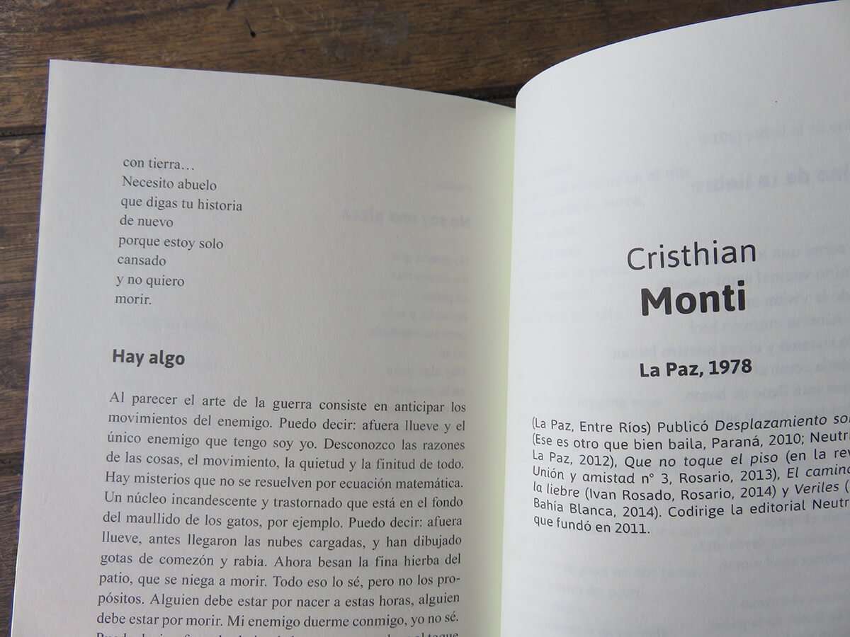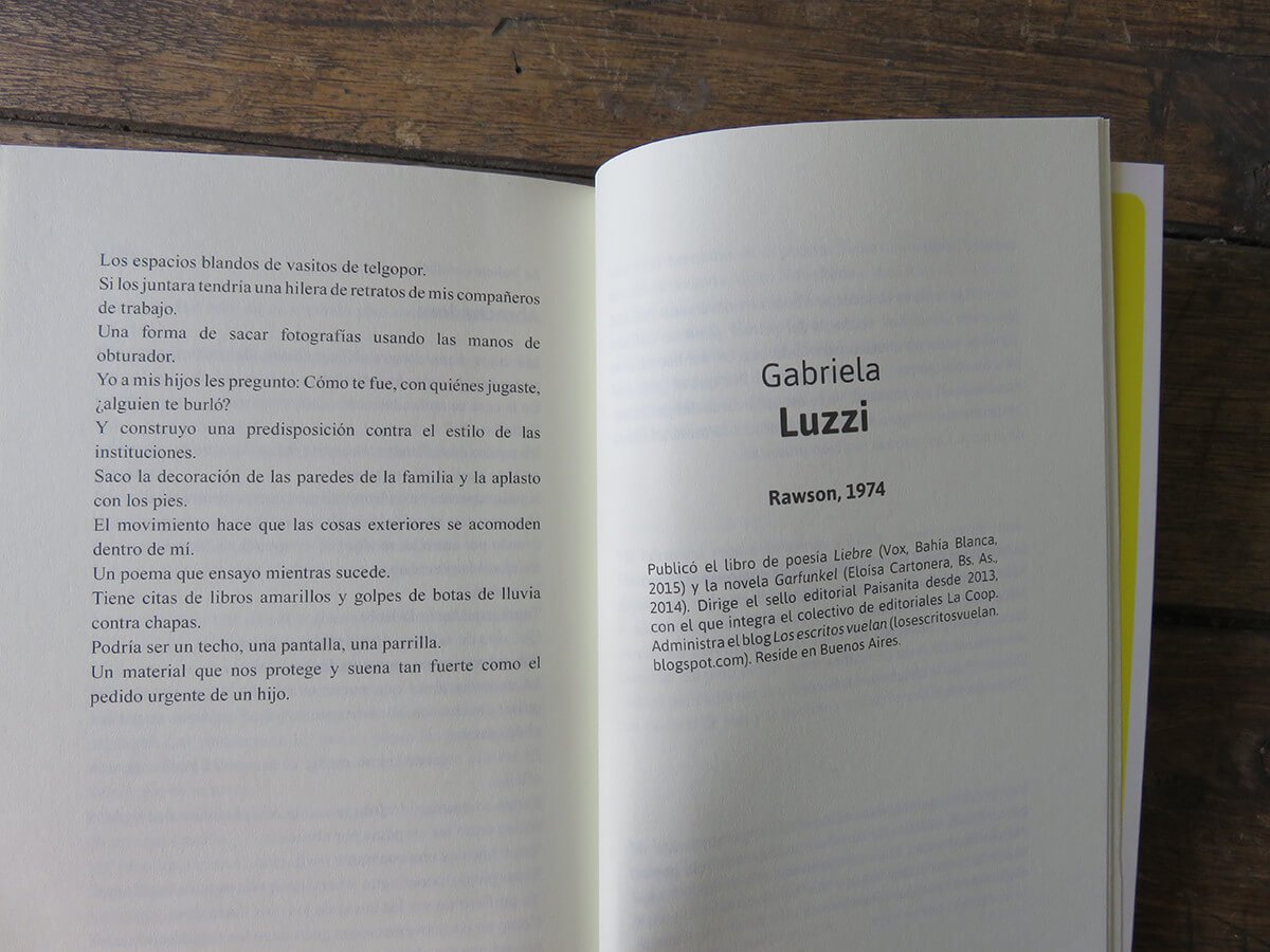 Alejandro Crotto, Analía Giordanino, Aníbal Cristobo, Carolina Musa, Carolina Pellejero, Cecilia Moscovich, Cecilia Pavón, Claudia Masin, Claudio Rosales, Cristian De Nápoli, Cuqui, Darío Zangrandi, Diego Carballar, Fabricio Simeoni, Fernanda Laguna, Fernando Callero, Francisco Garamona, Gabriela Bejerman, Gabriela Luzzi, Guillermo Neo, Ioshua, Javier Foguet, Lucas Tejerina, Lucía Bianco, Luciano Mete, Manuel Alemian, Marcelo Silva, María Medrano, Marina Mariasch, Marina Yuszczuk, Martín Rodríguez, Mauro Cesari, Mauro Lo Coco, Miguel Ángel Petrecca, Néstor Mendoza, Osvaldo Méndez, Pablo Cruz Aguirre, Pablo Katchadjian, Pedro Mairal, Roberta Iannamico, Romina Freschi, Santiago Alassia, Santiago Pintabona, Sebastián González, Sebastián Morfes, Sebastián Sánchez, Sergio Taglia, Soledad Castresana, Tamara Domenech, Verónica Viola Fisher, Walter Cassara, Washington Cucurto