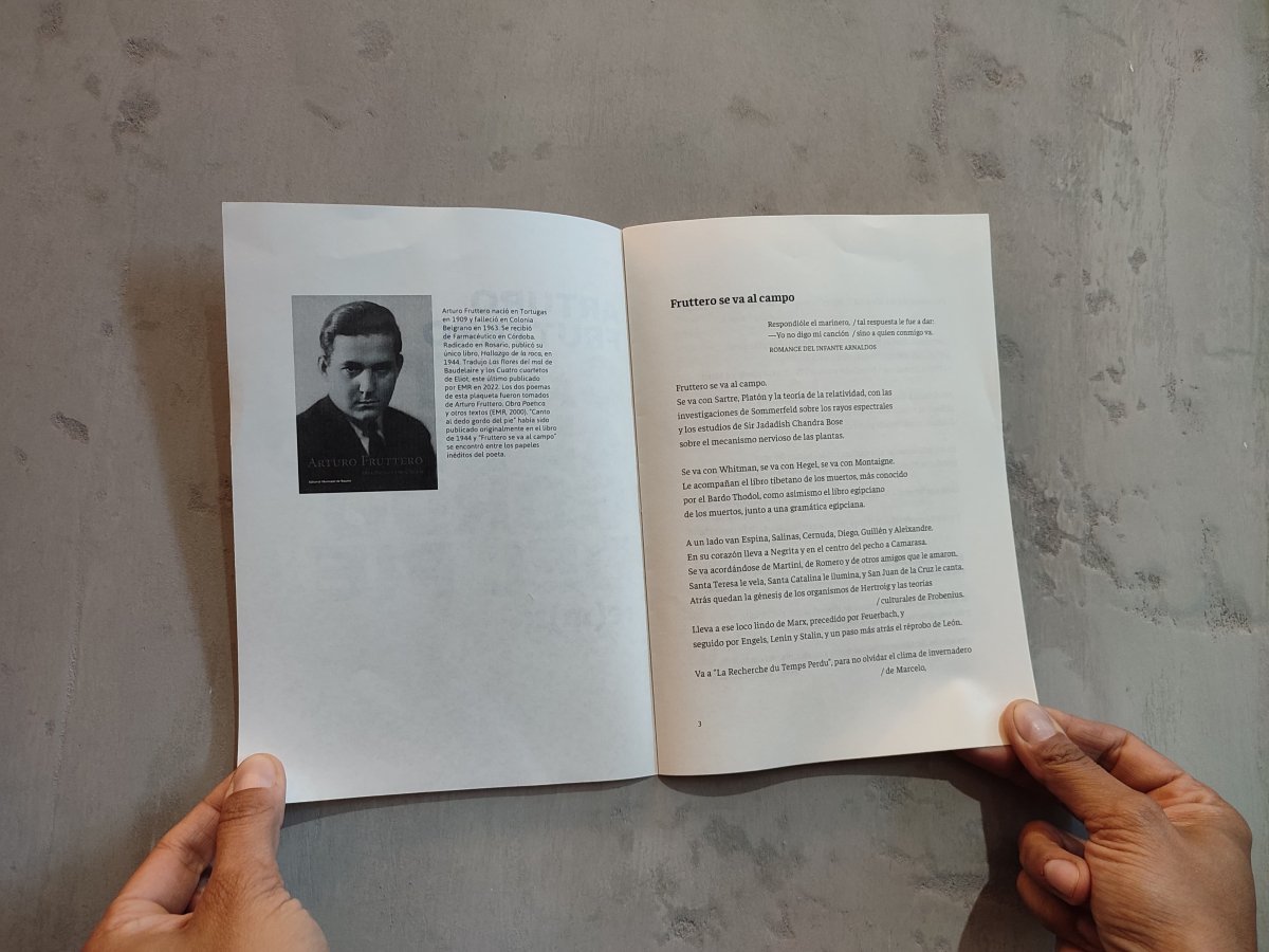 Este poema integra, junto a "Canto al dedo gordo del pie", una plaqueta de doble entrada. Los dos poemas fueron tomados de Arturo Fruttero. Obra poética y otros textos (EMR, 2000). "Fruttero se va al campo" se encontró entre los papeles inéditos del poeta.