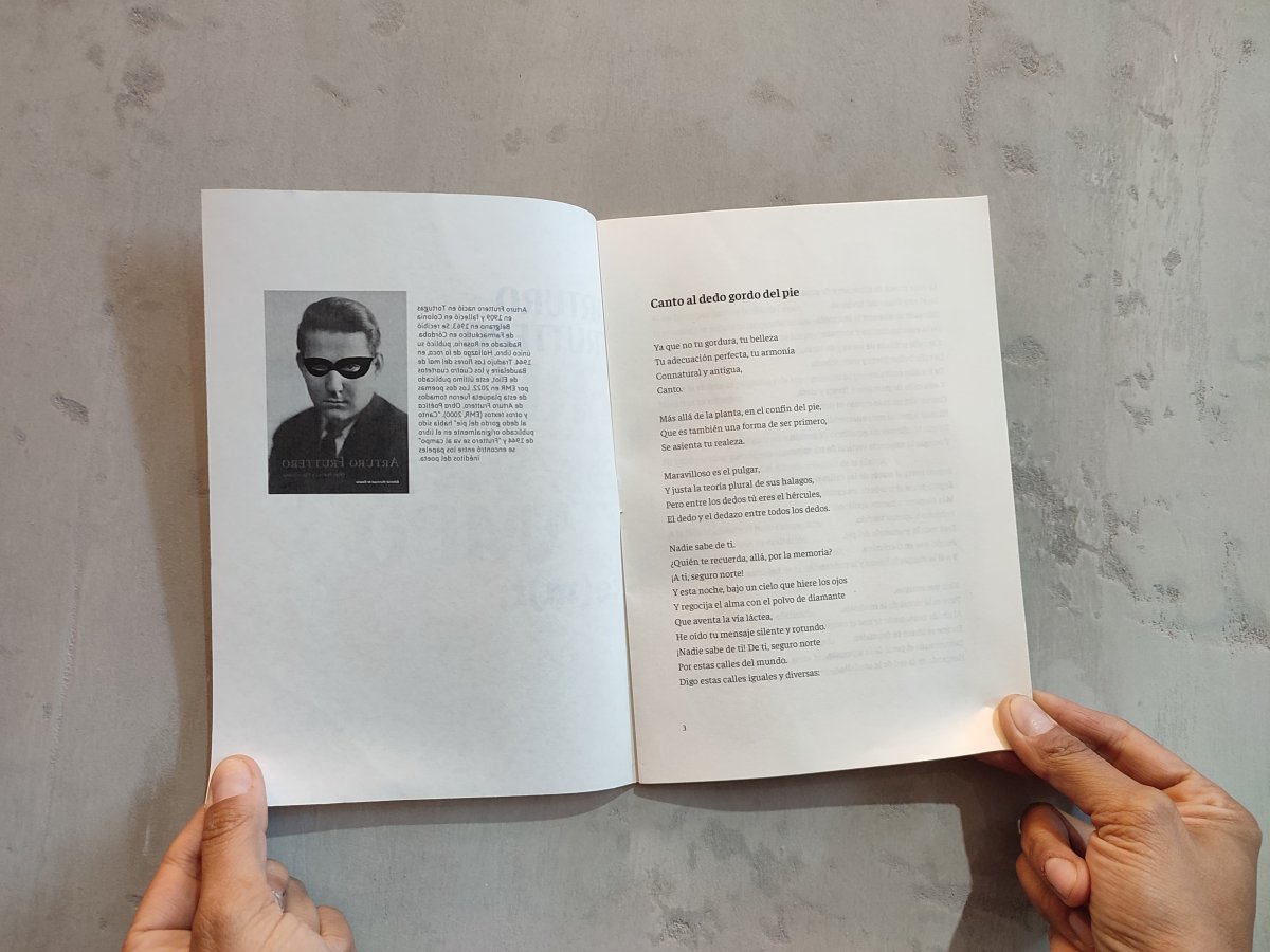 Este poema integra, junto a "Fruttero se va al campo", una plaqueta de doble entrada. Los dos poemas fueron tomados de Arturo Fruttero. Obra poética y otros textos (EMR, 2000). "Canto al dedo gordo del pie" había sido publicado originalmente en el libro de 1944.