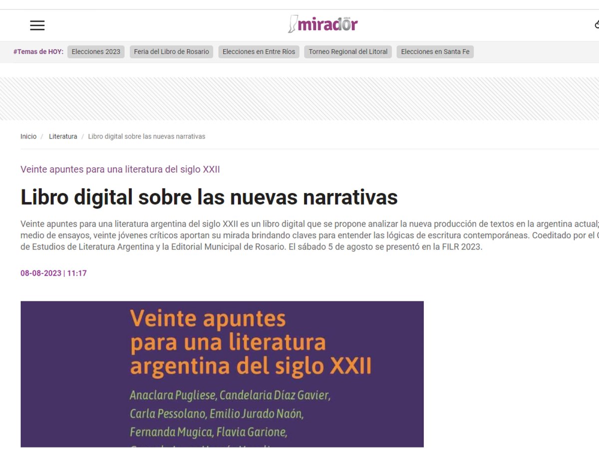 Veinte apuntes para una literatura argentina del siglo XXII es un libro digital que se propone analizar la nueva producción de textos en la argentina actual; por medio de ensayos, veinte jóvenes críticos aportan su mirada brindando claves para entender las lógicas de escritura contemporáneas. Coeditado por el Centro de Estudios de Literatura Argentina y la Editorial Municipal de Rosario. El sábado 5 de agosto se presentó en la FILR 2023.