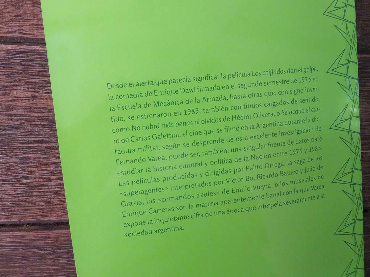 Desde el alerta que parecía significar la película Los chiflados dan el golpe, la comedia de Enrique Dawi filmada en el segundo semestre de 1975 en la Escuela de Mecánica de la Armada, hasta otras que, con signo invertido, se estrenaron en 1983, también con títulos cargados de sentido, como No habrá más penas ni olvidos de Héctor Olivera, o Se acabó el curro de Carlos Galetti, el cine que se filmó en la Argentina durante la dictadura militar, según se desprende de esta excelente investigación de fernando Verea, puede ser, también, una singular fuente de datos para estudiar la historia cultural y política de la Nación entre 1976 y 1983. Las películas producidas y dirigidas por Palito Ortega, la saga de los "superagentes" interpretados por Víctor Bo, Ricardo Bauleo y Julio de Grazia, los "comandos azules" de Emilio Vieyra, o los musicales de Enrique Carreras son la materia aparentemente banal con la que Varea expone la inquietante cifra de una época que inerpela severamente a la sociedad argentina.