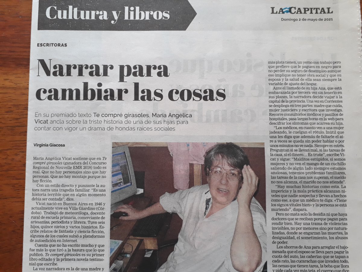 Por Virginia Giacosa. María Angélica Vicat sostiene que en Te compré girasoles (ganadora del Concurso Regional de Nouvelle EMR 2018) todo es real. Que no hay personajes sino que hay personas. Que no hay montaje porque no hay ficción. Con un estilo directo y punzante la autora narra una tragedia familiar. “Es una historia terrible que en algún momento debía ser contada”, dice. Vicat nació en Buenos Aires en 1946 y actualmente vive en Villa Giardino (Córdoba). Trabajó de meteoróloga, docente rural de escuela primaria, comerciante de artesanías, periodista y librera. Tuvo seis hijos, quince nietos y varios bisnietos. Escribe relatos de fantasía y ciencia ficción, algunos de los cuales subió a plataformas de autoedición en Internet. Cuenta que no ha escrito mucho y que fue más lo que tiró a la basura que lo que publicó. Te compré girasoles es su primer libro editado y la primera novela testimonial que escribe. La voz narradora es la de una madre y su gran preocupación, la vida de una de sus hijas: Ana. Ambientada en febrero de 2003 en una Corrientes asfixiante y calurosa, la historia entrelaza el cotidiano de toda una familia y sus problemas, la crisis económica de esa época, la corrupción política, el poder de la oligarquía terrateniente, los pagos por izquierda como moneda de todos los días, las fallas de los servicios de salud, el maltrato déspota de los patriarcas con sus hijos y la vulnerabilidad de las mujeres en una sociedad donde los maridos se creen sus dueños. El libro comienza con un epígrafe de Hannah Arendt: “En la medida en que realmente pueda llegarse a «superar» el pasado, esa superación consistiría en narrar lo que sucedió”. La autora narra para paliar los ecos de la tragedia familiar que todavía la sigue atormentando y también para exigir justicia por Ana y para todas las que pasaron y las que vendrán. Su palabra cobra la validez de un alegato, pero el tono de su escritura nada tiene que ver con el de una crónica periodística y es magistralmente literario. Cuando se le pregunta sobre cómo nació la idea de contar esta historia dispara: “Todo lo que está escrito en ese libro es verdad. Letra por letra. Hasta lo más mínimo. Eso es lo terrible. Esas cosas suceden y no se saben”. Dirá también que pidió a los editores que no modificaran nada más que los nombres: todos han sido cambiados salvo el de Ana. Tal es así, que cuando alguien pronuncia el de la narradora, le dice “Luisa” en vez “María Angélica”. Algo que la pone en cierto entredicho con la idea de realidad que ella insiste en sostener. Como si el hecho mismo de narrar no fuese ya hacer ficción. Como si narrar la vida no fuera también historizar lo novelado. Sin acudir a figuras complejas Vicat escribe con la certeza de quien estuvo ahí pero también con la precisión de la oralidad. Con una prosa sencilla y cruda, pero a la vez inteligente y hermosa, su escritura no tiene aderezos ni artificios. Como la voz de una tía abuela que nos cuenta una tragedia acontecida hace años, nos convence desde el principio hasta el final de su relato al punto de que nos vemos en él. Todas las familias entran en esta novela. Todos somos la familia de Vicat. “¿Qué se hace con estos parientes? No hay libro ni manual que te lo diga”, dice la narradora con una voz que transmite a lo largo de la nouvelle el agobio de ser sostén de todo y a la vez el afán por dejar de serlo. Un hermano parásito que está deprimido y sin trabajo y “cree que tienen la obligación de alimentarlo porque es un hombre solo”, un nieto no querido por sus padres que no estudia y roba con los pibes de la esquina ganándose la bronca del barrio, una hija que estudia medicina en Rosario porque en Corrientes los exámenes pueden estar arreglados y los aprobados son para los que más plata tienen, un yerno con trabajo pero que prefiere que le paguen en negro para no perder su seguro de desempleo aunque eso implique no tener obra social y que su esposa y la salud de ella sean siempre la variable de ajuste del hogar. Ante el llamado de su hija Ana, que está embarazada por tercera vez sin tenerlo en sus planes, la narradora decide viajar a la capital de la provincia. Una vez en Corrientes se despliega en tres partes: madre que cuida, mujer justiciera y escritora que investiga. Recorre consultorios médicos y pasillos de hospitales, pasa largas horas en internet para descifrar los síntomas que acarrea su hija. “Los médicos, en cuanto ven a una mujer jadeando, le cuelgan el rótulo. Inútil que una les diga que además de faltarle el aire a veces se queda sin poder hablar o por unos minutos no ve nada. Siempre es estrés. Preguntan si se llevan mal, si las tareas de la casa, si el dinero… Es triste”, escribe Vicat y sigue: “Malditos estúpidos, si somos mujeres y no ven el mango de un cuchillo saliendo de algún lado siempre estamos ansiosas, tenemos problemas familiares, las tareas de la casa nos superan, el sueldo no nos alcanza, el marido no nos atiende”. “Hay muchas historias como esta. La impericia y la mala práctica alcanzan niveles que nadie sospecha y llevan a hechos como ese, a que un médico te diga: «Tiene los signos vitales bien» y la persona se está muriendo”, dispara. Pero no mata solo la desidia ni que haya doctores que se reciban porque pagan para rendir bien. Hay una trama de violencias invisibles, no por menores sino por naturalizadas, donde se engarzan las muertes, la desigualdad, el sometimiento, los abusos de poder. Los ahorros de Ana para arreglar el bajomesada que el esposo se lleva para pagar la cuota del auto, las cañerías que se tapan a cada rato, las cucarachas que invaden todo, las nenas que tienen tarea, la beba que llora y pide cada vez más teta, el cuerpo que dice basta, la cabeza que duele, el fantasma de su padre abusador que sobrevuela por la noche en forma de pesadilla pero que en la vigilia es la marca tatuada de la violencia sexual q