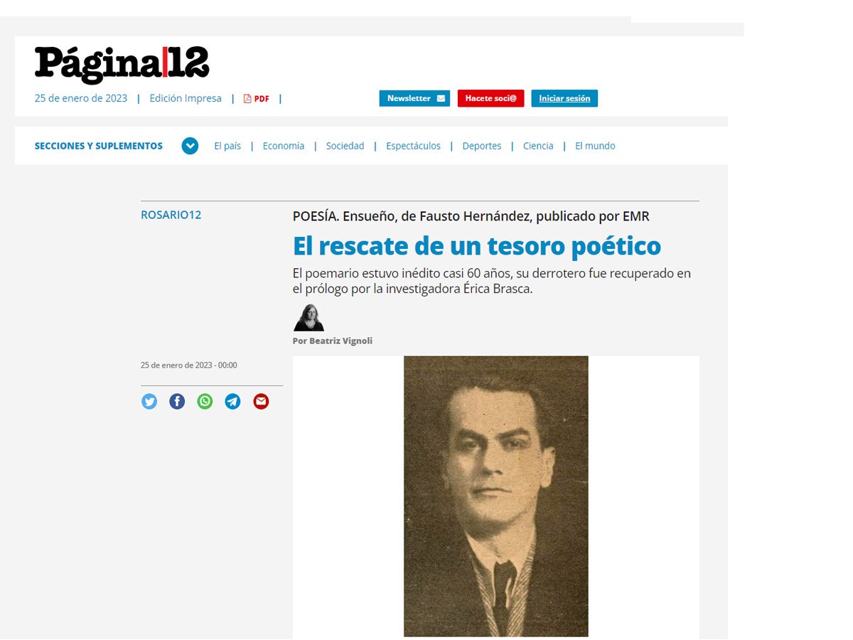 Por Beatriz Vignoli. En el año pasado, que ya se llevaron tanto el sol como la luna, la Editorial Municipal de Rosario no sólo no se dejó arredrar por el aumento del costo del papel y la reducción de presupuesto, sino que afinó el ingenio y la laboriosidad para sacar a la luz un tesoro literario recobrado. Publicado en una edición artesanal de 250 ejemplares numerados, Ensueño, de Fausto Hernández (1897-1959), constituye el testimonio poético de una figura elusiva, protagónica de su campo cultural pero a la vez distante; y además es uno de esos grandes libros que cambian la historia de una literatura. Si bien se suponía que debía haber alguna pieza faltante o perdida en la producción poética de Hernández (él hablaba de una trilogía de la que solo había editado dos volúmenes, Pampa y Río), su obra póstuma esperó casi 60 años en la sombra, entre los papeles y otros materiales de archivo del pintor Julio Vanzo. En la nota necrológica que sus compañeros del diario La Tribuna le publicaron en ese medio el 5 de mayo de 1959, se anticipaba la edición por la editorial santafesina Castelví del libro, titulado Ensueño. La muerte la llevamos dentro. "Esto no ocurrió", dice la investigadora Érica Brasca en el prólogo. A comienzos de 2018, gracias a Mercedes Naidich (sobrina de Vanzo y custodia de su archivo), Brasca tuvo acceso a un manuscrito firmado y final, datado en marzo de 1959. Por esa fecha, dos meses antes de morir, el poeta se lo habría dejado al pintor, listo para su edición: "56 poemas mecanografiados en hojas tamaño oficio de papel finlandés, con correcciones y tachaduras realizadas por el propio Hernández". Ensueño no es el tercer libro perdido de la trilogía In mente; pertenece (se nos aclara) a otro proyecto. La culminación de In mente iba a ser el tomo "Alma", que el poeta nunca escribió. "De Pampa se conocen dos versiones", escribe Brasca; "la primera de 1938 y la segunda, muy modificada, de 1958". Liliana Ruiz, la directora de Baltasara Editora, que le publicó en el siglo XXI a Hernández tres piezas teatrales y dos ensayos (parte de esa obra había sido editada por su padre, Laudelino Ruiz, en vida del autor), conservó la edición de 1943 de Río, por La Canoa. El legado Ruiz testimonia las amistades del escritor entre los artistas de la ciudad. Una foto documentaba la visita a Rosario, en abril de 1939, del poeta Pablo Neruda, en busca de ayuda para los republicanos españoles que estaban prisioneros en los campos de concentración franquistas: en la toma posan su esposa Delia del Carril, el mecenas Lelio Zeno, el escritor y editor rosarino Ricardo Montes y Bradley, y los poetas Hernández y Arturo Fruttero. Brasca, por su parte, describe la foto publicada en el Boletín de Cultura Intelectual en mayo de 1939, tomada en la presentación de Pampa y donde reconoce, junto al homenajeado, a Simón Neuschlosz (presidente de la asociación antifascista AIAPE) y a Arturo Fruttero, Alcides Greca, Carlos Carlino y el escultor Erminio Blotta. Liliana Ruiz conoció a Fausto Hernández cuando era muy chica. "Era un hombre muy reservado", contó en una entrevista de 2014. "Lo que me llamaba la atención era su cabellera". Le parecía fiel y preciso el retrato de Leónidas Gambartes que ilustra su "Autocrítica" publicada en 1941 en la revista Paraná, que editaba Ricardo Montes y Bradley. Allí también, según Brasca, se publicaron versiones anteriores de algunos poemas de Ensueño. Brasca sitúa a Hernández en el panorama de la poesía del '40. Otra forma de categorizarlo es dentro de la "poesía metafísica", muy influyente por entonces. Con investigación y prólogo por Érica Brasca, Ensueño se presentó el 19 de agosto en la Biblioteca Popular Constancio C. Vigil, en el marco de las II Jornadas “La ciudad que yo inventé”, que organiza el Centro de Estudios de Literatura Argentina de la Universidad Nacional de Rosario. Hablaron Érica Brasca, Osvaldo Aguirre y Daniel García Helder. Ya desde el título, Ensueño dialoga con la poesía y la dramaturgia del Siglo de Oro: "La vida es sueño con sol", apunta el poeta en un verso que alude al drama barroco La vida es sueño, de Calderón de la Barca. Este es el libro de alguien que siente que le queda poco tiempo, no sólo para vivir, sino para completar su obra magna secreta: no sólo la obra poética sino el trabajo de preparación para la muerte que lo ocuparía, a juzgar por las referencias a aquella y por el desarrollo de una cosmovisión propia en los poemas. Los 56 poemas, hondos y hermosos pero no de fácil lectura, alternan en su forma entre la reiteración de probadas convenciones modernistas (verso medido, rima consonante) y la exploración de estilos nuevos. El paisaje urbano que llega a traslucirse en filigrana por entre las visiones 4D es una ciudad de Rosario que deja atrás su fisonomía bucólica de aldea y emprende una acelerada modernización, plasmada en los altos edificios. El soñar, en los poemas, es una fuente importante. El poema "Entrepisos" (el 35) narra el vértigo de un ascensor como símbolo de una búsqueda espiritual concreta. Inspirado tal vez en un sueño, despliega recursos como el verso libre y el criptograma. El poema 24, "Albo sueño en vida obscura", retoma las ideas de la vida como sueño y la muerte como despertar. Figuras de una geometría sagrada como pauta de lo vivo son recurrentes en las imágenes del caracol, la espiral y algo que "parece una S, pero es un ovillo" (la doble helicoide). Asombran las metáforas científicas y técnicas: "Un viento seco borra los datos de la vida", anota el poema 17, "El tiempo es una sensibilidad". Una obsesión por saber y conocer la verdad última detrás de las apariencias sensibles alienta en toda la obra. Si llegó allí el poeta, lo ignoramos. Pero agradecemos el magnífico legado de estos versos.Editorial