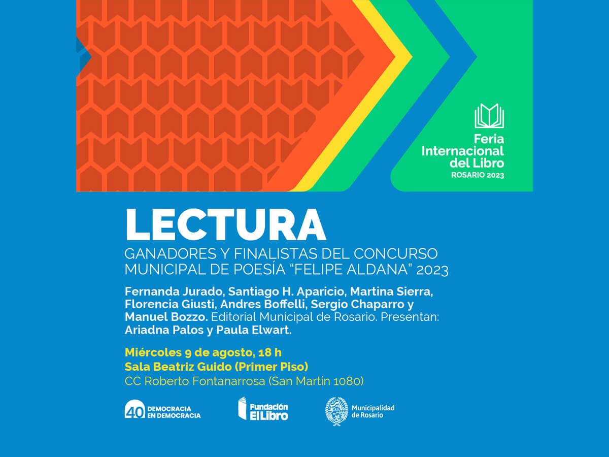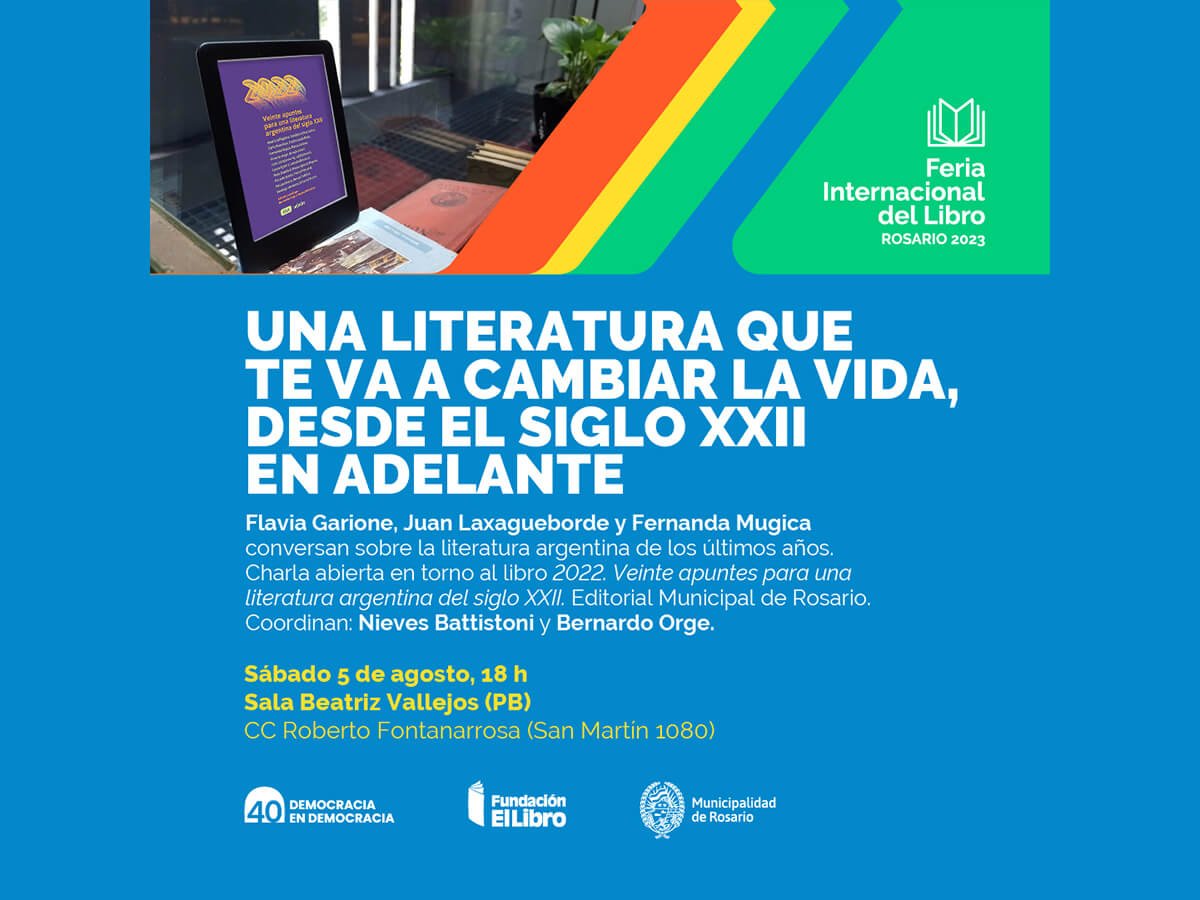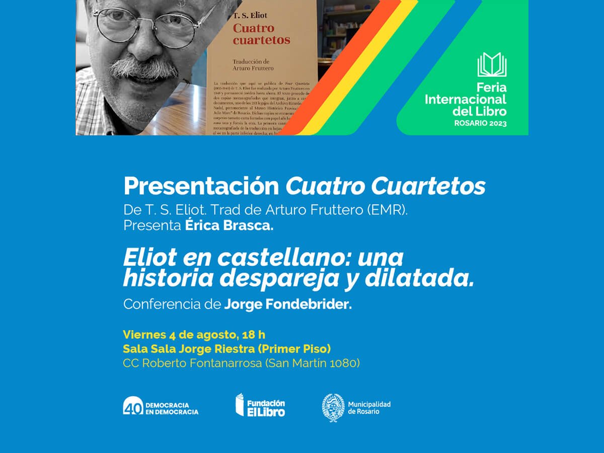 Con el eje “Lecturas del presente” y en conmemoración de los 40 años del regreso de la democracia en Argentina, se llevará a cabo la 25ª edición de la Feria del Libro Rosario 2023, con entrada libre y gratuita. Entre el 2 y el 12 de agosto, el Centro Cultural Roberto Fontanarrosa alojará el evento que reunirá a librerías de la ciudad, charlas, talleres y shows musicales, entre otras propuestas. Actividades: viernes 4 de agosto 18h Presentación de la traducción de Arturo Fruttero de los "Cuatro Cuartetos", de T. S. Eliot (EMR), por Érica Brasca. Conferencia de Jorge Fondebrider: "Eliot en castellano: una historia despareja y dilatada". Primer Piso - Sala Jorge Riestra sábado 5 de agosto 18h Una literatura que te va a cambiar la vida, desde el siglo XXII en adelante. Flavia Garione, Juan Laxagueborde y Fernanda Mugica conversan sobre la literatura argentina de los últimos años y sus vínculos con las nuevas tecnologías, la escritura en comunidad, el arte contemporáneo, la música y lo político. Charla abierta en torno al libro “2022. Veinte apuntes para una literatura argentina del siglo XXII”. Editorial Municipal de Rosario. Coordinan: Nieves Battistoni y Bernardo Orge. PB - Sala Beatriz Vallejos miércoles 9 18h Lectura de Fernanda Jurado, Santiago H. Aparicio, Martina Sierra, Florencia Giusti, Andres Boffelli, Sergio Chaparro y Manuel Bozzo; ganadores y finalistas del Concurso Municipal de Poesía “FELIPE ALDANA” 2023, Editorial Municipal de Rosario. Presentan: Ariadna Palos y Paula Elwart. Primer Piso - Sala Beatriz Guido Además todo el catálogo de la Ediotorial estará en la planta baja de la feria en el stand de EMR Librería municipal.