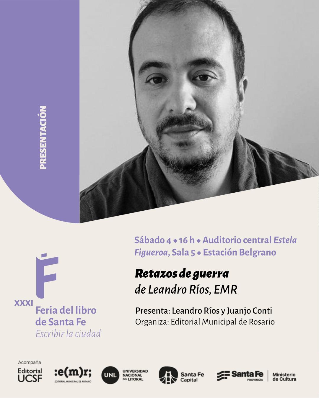 El sábado 4 de octubre a las 16 h, en el marco de la XXXI Feria del libro de Santa Fe en el Auditorio central Estela Figueroa, Sala 5, en Estación Belgrano (Blvd. Gálvez 1150) se presentará Retazos de guerra de Leandro Ríos, última nouvelle publicada por la Editorial Municipal de Rosario.