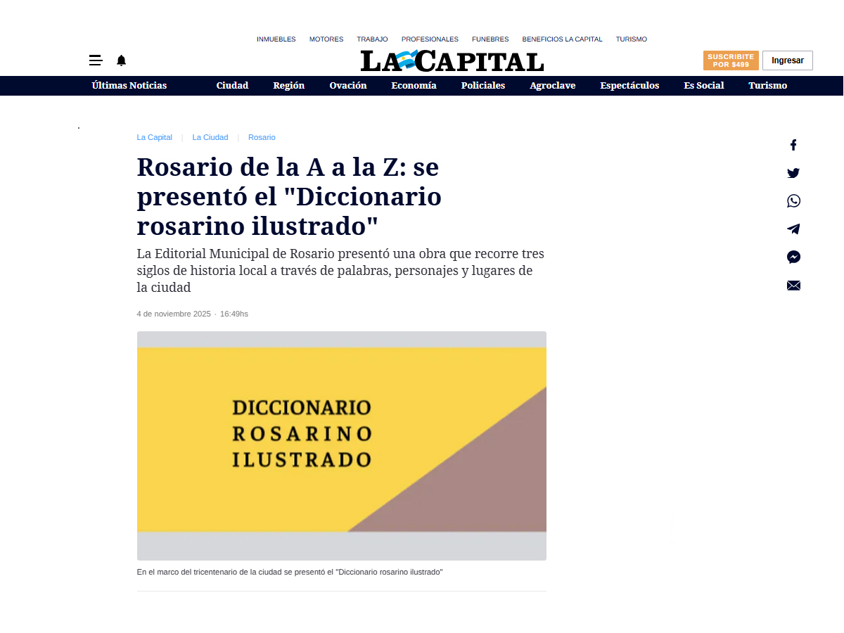 Se trata de “un repertorio ordenado alfabéticamente de artículos que resaltan distintos datos biográficos de la ciudad de Rosario a lo largo de sus 300 años de vida”. El libro, que ya se encuentra a la venta en la EMR Librería Municipal, ubicada en Presidente Roca 731, está inspirado en el “diccionario” que durante décadas redactó Wladimir C. Mikielievich.